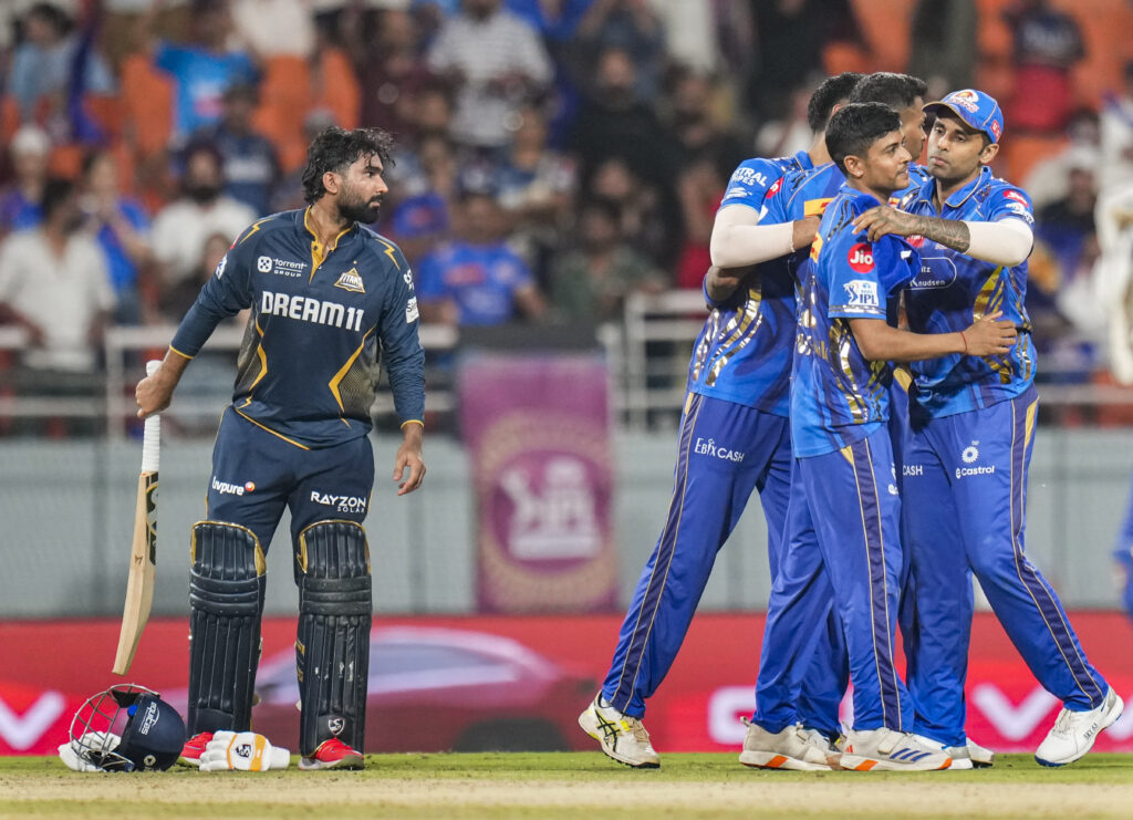 New Chandigarh: Mumbai Indians’ Hardik Pandya and Trent Boult celebrate the wicket of Gujarat Titans’ Sherfane Rutherford during the Indian Premier League (IPL) 2025 Eliminator cricket match between Mumbai Indians and Gujarat Titans, in New Chandigarh, Friday, May 30, 2025. (PTI Photo/Ravi Choudhary)(PTI05_30_2025_000634B)