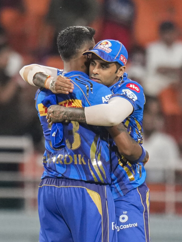 New Chandigarh: Mumbai Indians’ Hardik Pandya and Suryakumar Yadav celebrate after the team won the Indian Premier League (IPL) 2025 Eliminator cricket match against Gujarat Titans, in New Chandigarh, Friday, May 30, 2025. (PTI Photo/Ravi Choudhary)(PTI05_30_2025_000646B)