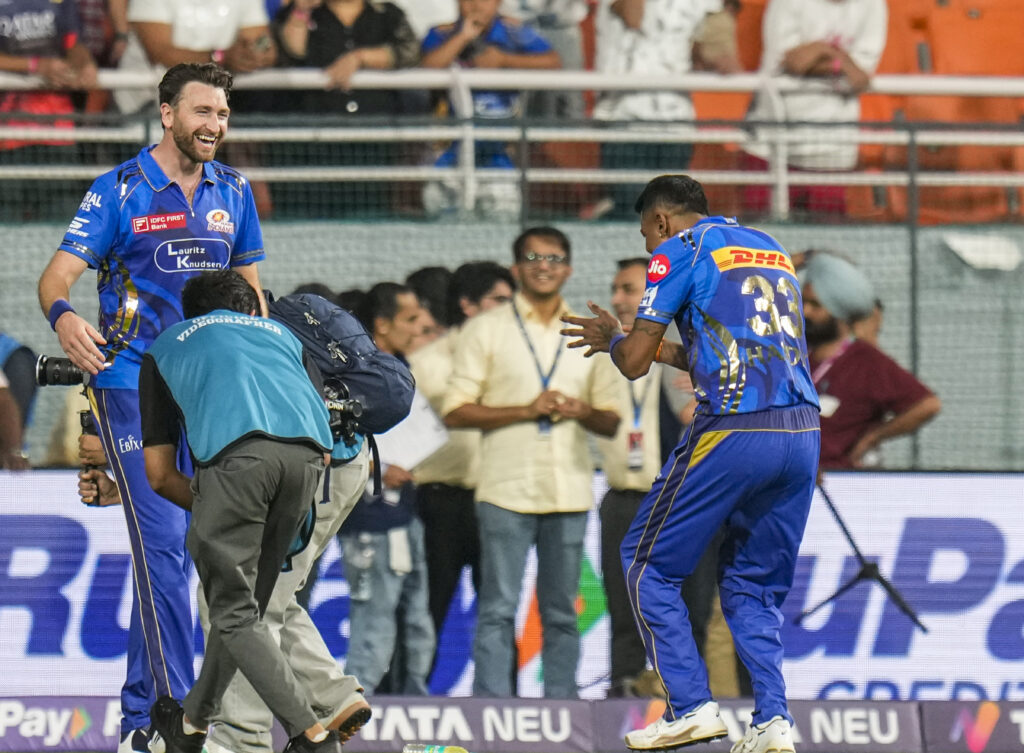 New Chandigarh: Mumbai Indians’ Hardik Pandya and Richard Gleeson celebrate after the team won the Indian Premier League (IPL) 2025 Eliminator cricket match against Gujarat Titans, in New Chandigarh, Friday, May 30, 2025. (PTI Photo/Ravi Choudhary)(PTI05_31_2025_000028B)