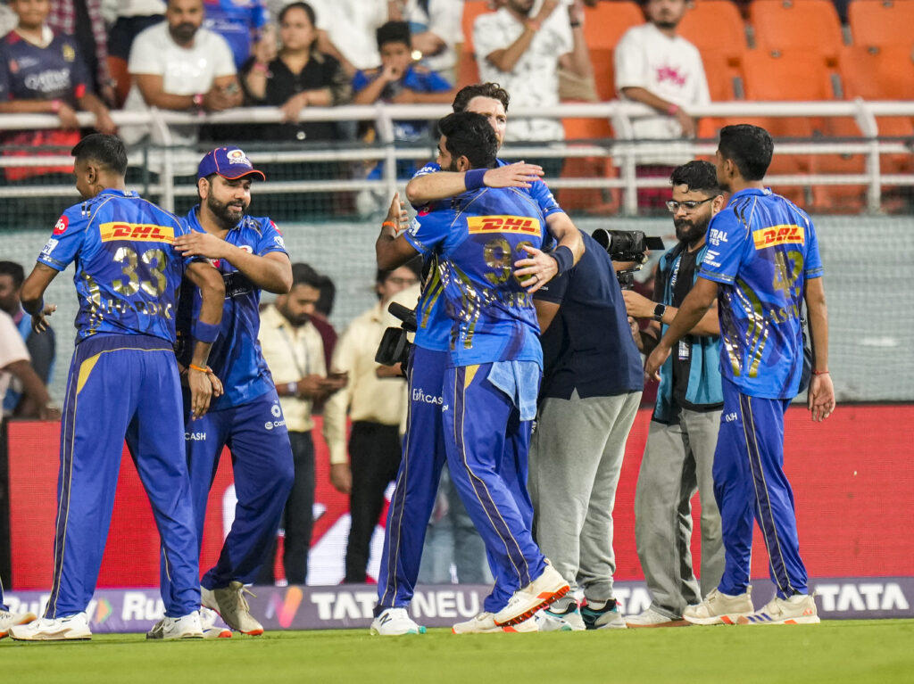 New Chandigarh: Mumbai Indians’ Hardik Pandya being greeted after his team won the Indian Premier League (IPL) 2025 Eliminator cricket match against Gujarat Titans, in New Chandigarh, Friday, May 30, 2025. (PTI Photo/Ravi Choudhary)(PTI05_31_2025_000013B)