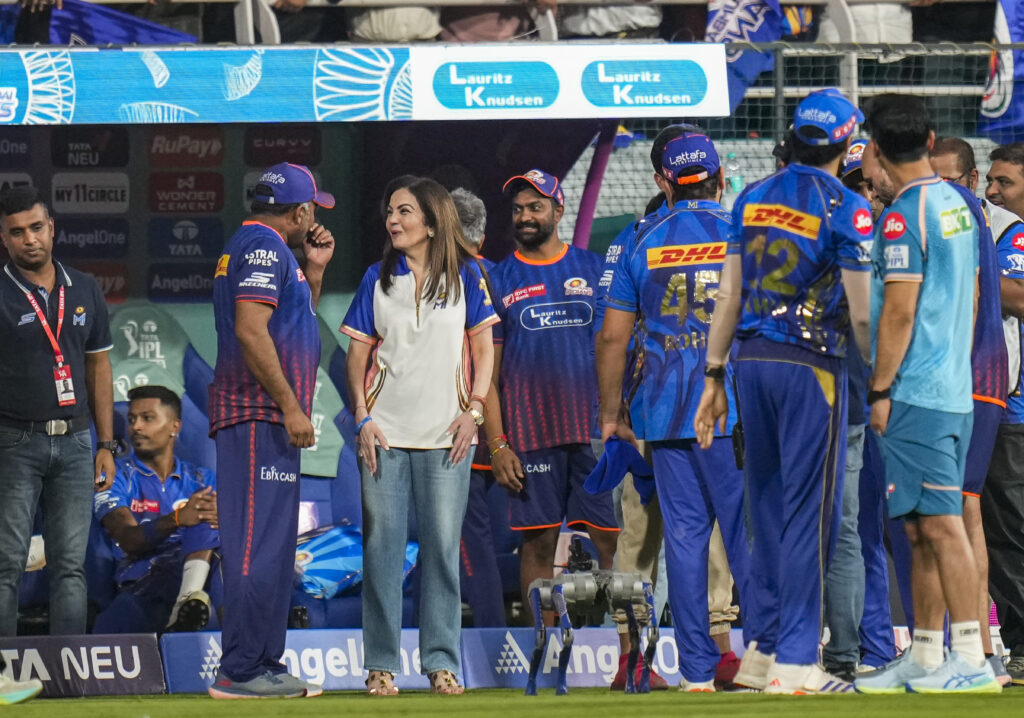 New Chandigarh: Mumbai Indians’ co-owner Nita Ambani with coach and players after the team won the Indian Premier League (IPL) 2025 Eliminator cricket match against Gujarat Titans, in New Chandigarh, Friday, May 30, 2025. (PTI Photo/Ravi Choudhary)(PTI05_31_2025_000025B)