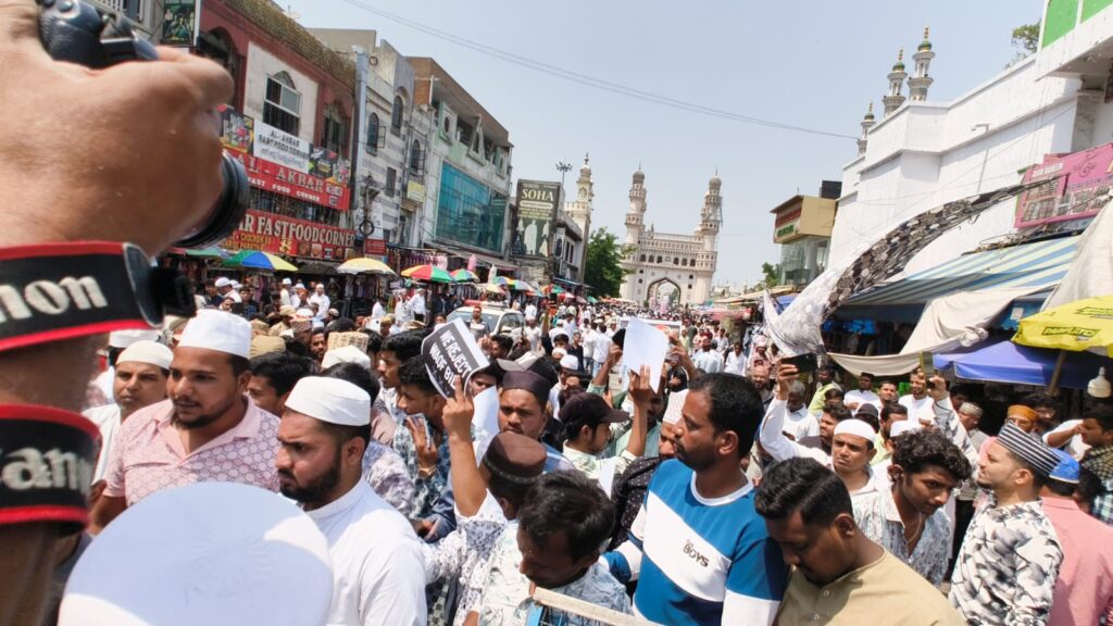 Hyderabad: The area near Makkah Masjid witnessed a protest against the Waqf Amendment Act following Friday prayers.