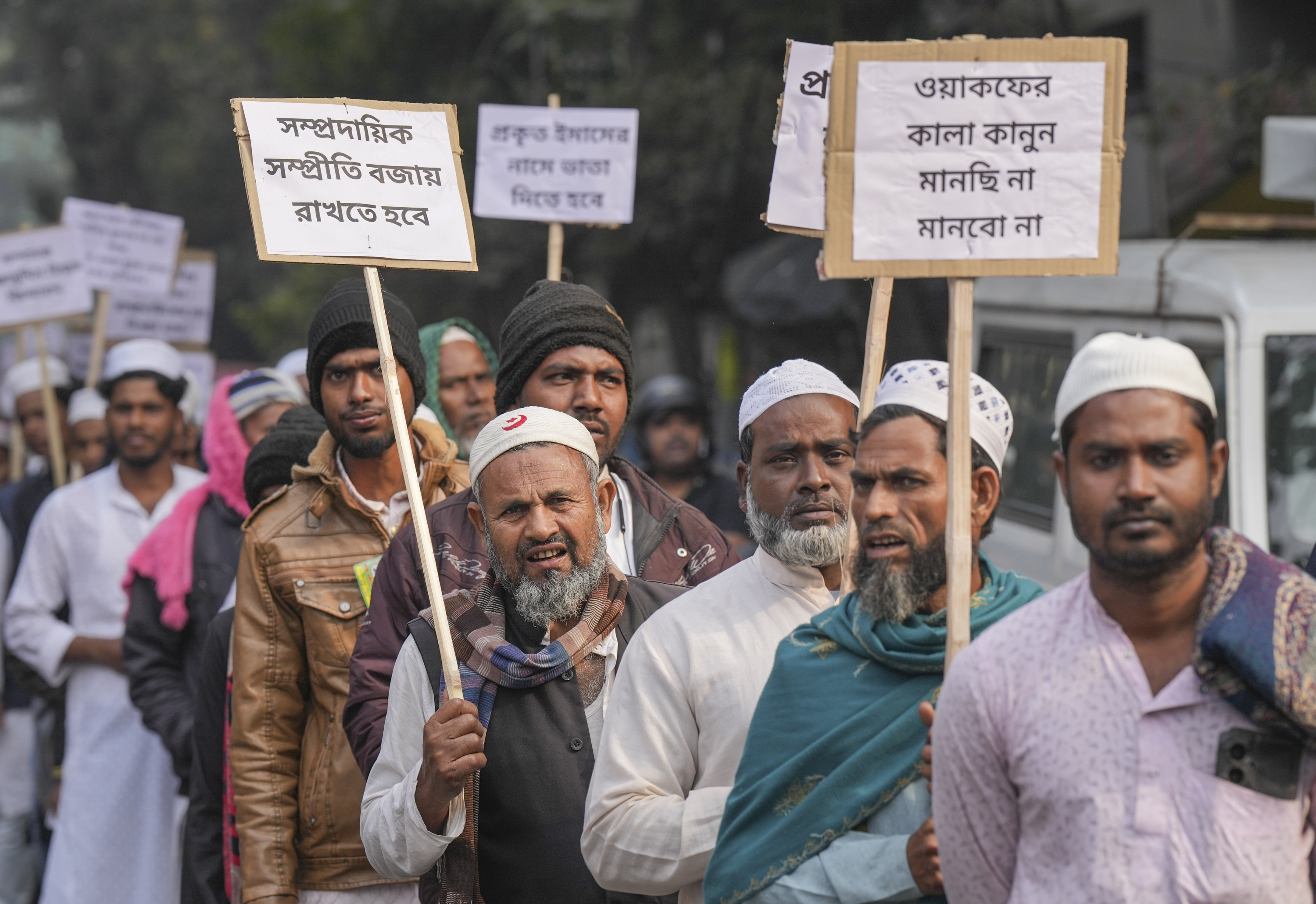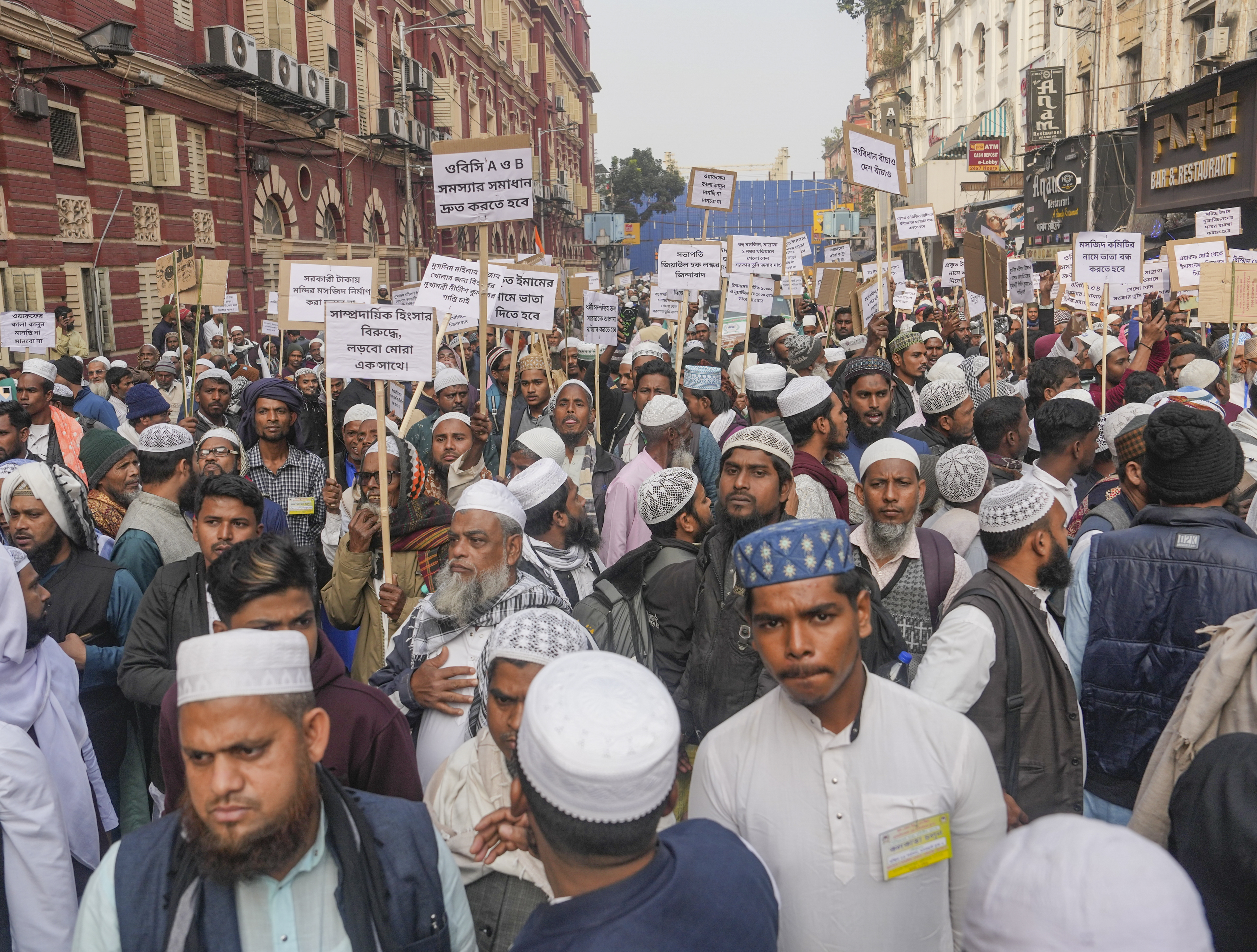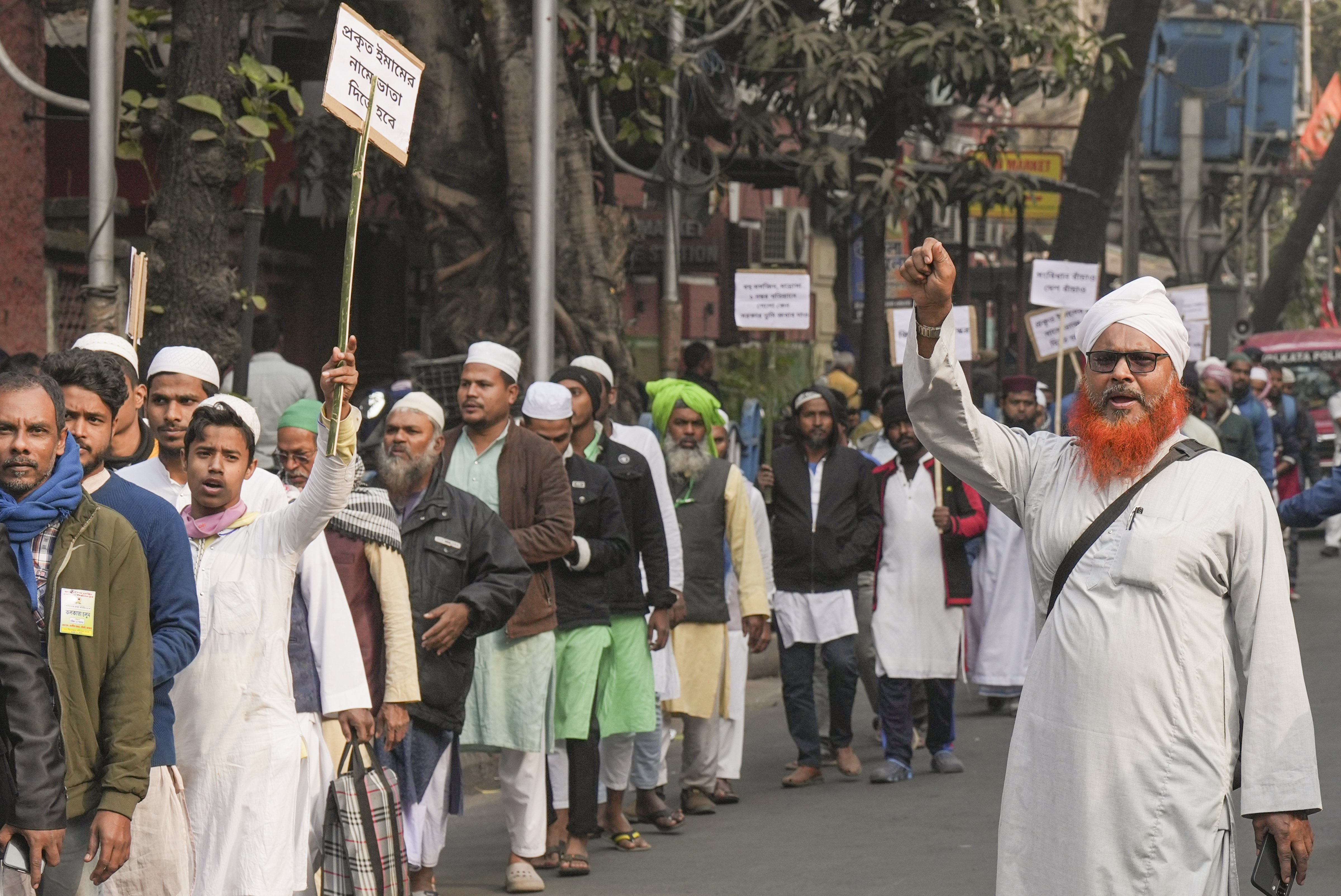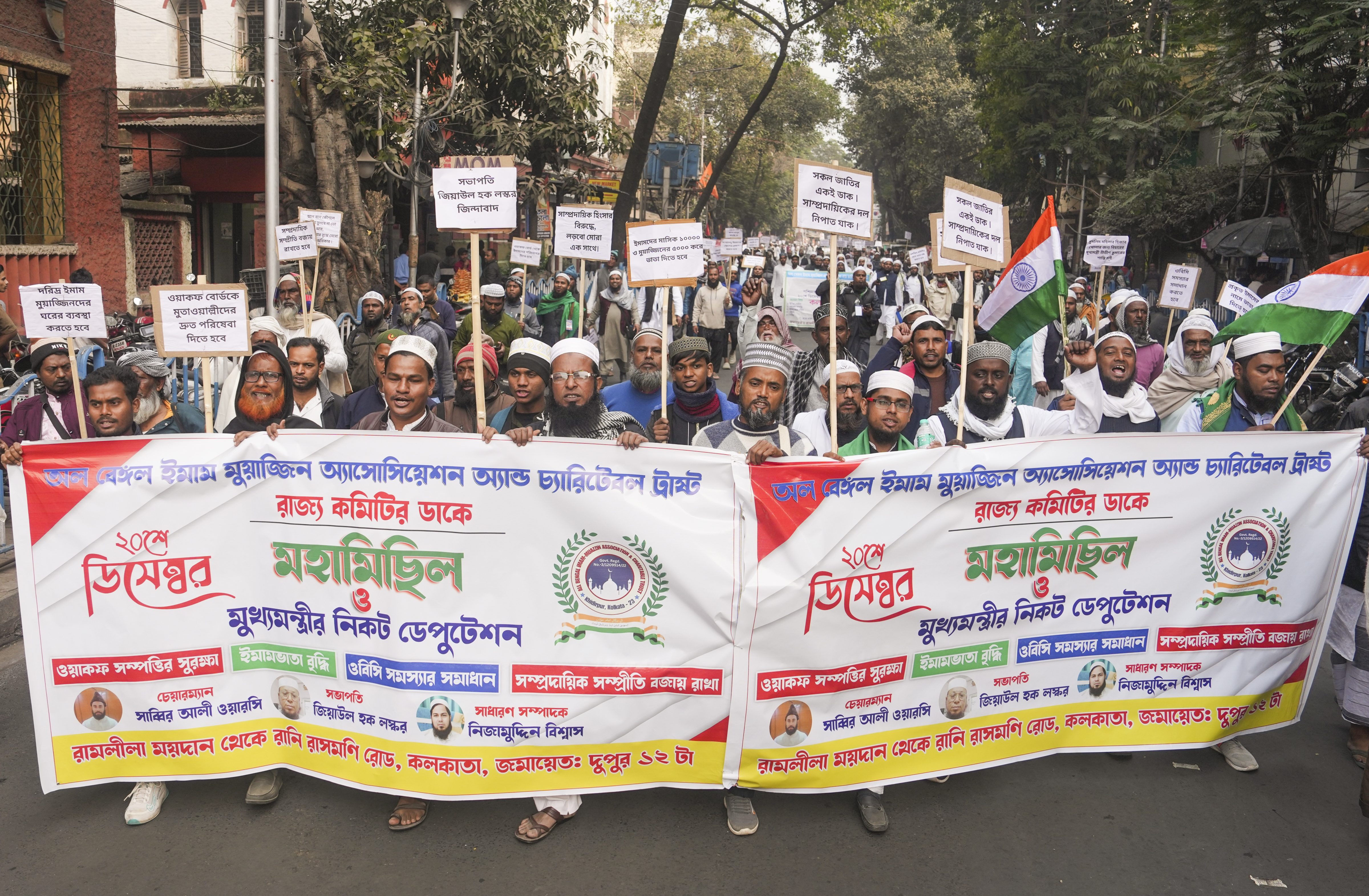 Members of the All Bengal Imam Muazzin Association and Charitable Trust (WB State Committee) take part in a protest march opposing the Waqf (Amendment) Act, 2025, and demanding the protection of Waqf properties, in Kolkata, Saturday, Dec. 20, 2025. (PTI