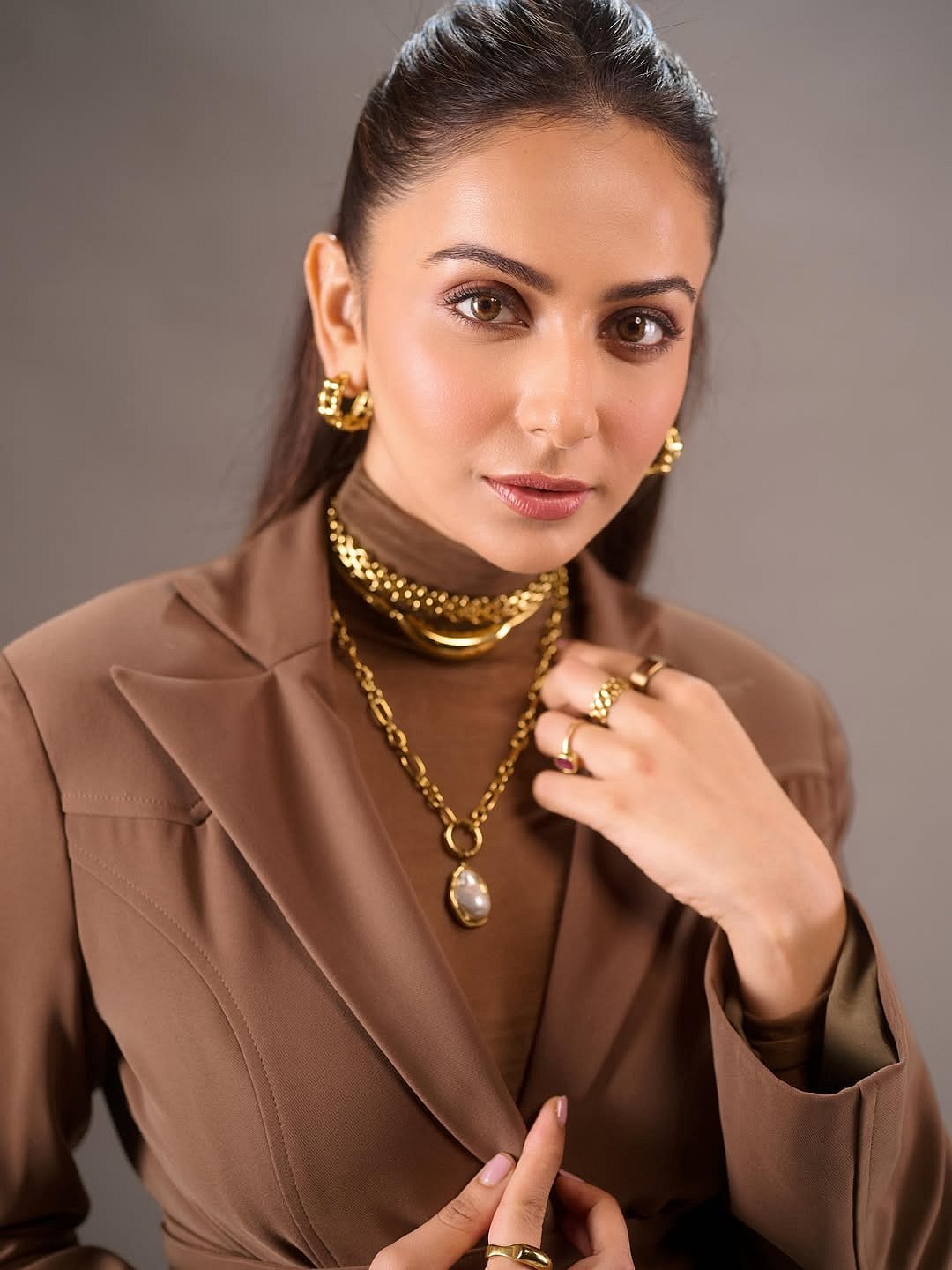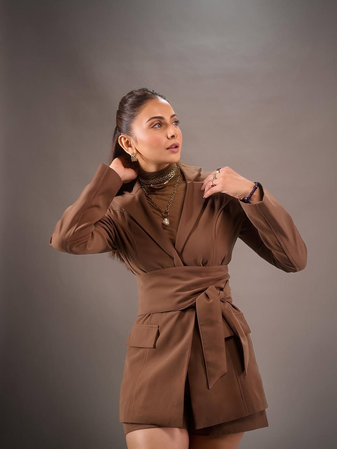 Rakul Preet Singh is proving once again that she is a certified style star. Fresh off the success of De De Pyaar De 2, the actor has been treating her fans to a string of fashionable appearancesBlending officewear with a bold, trendsetting touch, Rakul stepped out in a chocolate brown co-ord set from TorqadornThe structured blazer featured a front tie-up detail that added flair to the outfit, while its matching high-waist shorts brought a playful edgeTo keep the outfit refined and season-appropriate, the 35-year-old star styled the blazer with a brown turtleneck top underneathThe monochromatic palette delivered a sleek and cohesive vibe. Rakul elevated the aesthetic further with brown stilettosHer accessorising game was on point too, layered gold jewellery in multiple textures and sizes gave the outfit a luxurious lift. Chunky chokers, a delicate long chain featuring a pearly stone, and gold hoop earrings completed her glamorous ensembleMatching her outfit’s warm tones, Rakul opted for bronzed, dewy makeup. A soft brown smoky eye, khol-rimmed eyelids, glossy brown lips, and a touch of natural blush tied together her radiant fall-ready beauty look