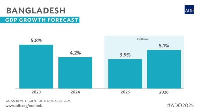 The Asian Development Outlook (ADO) April 2025 report by the Asian Development Bank paints a cautious picture of Bangladesh’s future. Bangladesh, the report said, is expected to witness a GDP growth of only 3.9% in FY2025 against the 4.2% growth it recorded in FY2024. Growth could improve to 5.1% in FY2026, but political stability and structural reforms will become decisive in that.