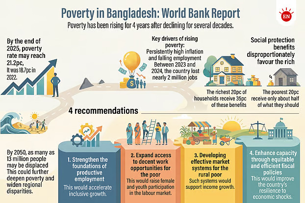 The World Bank released a report on Tuesday, 25th November, which has also raised red flags for the Nation’s poverty rate. Their latest projections show that Bangladesh’s poverty rate is climbing again after decades of improvement. According to the World Bank’s micro-simulation model, the poverty rate may cross 21% in 2025. The number of poor people is estimated at around 36 million.