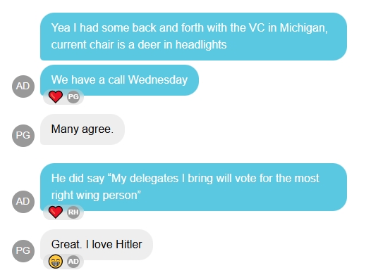 The GOP leaders also talked about Nazism with one of them writing, “an we get them to start releasing Nazi edits with her… Like pro Nazi and faciam [sic] propaganda.”