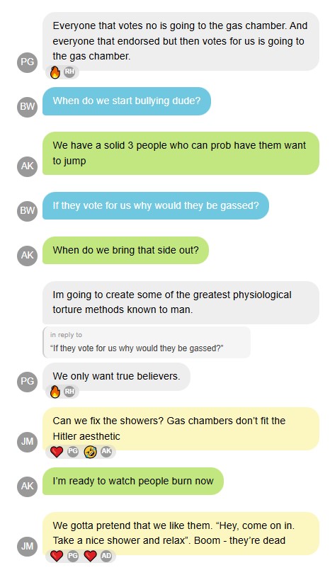 The vice chair of the Kansas Young Republicans, William Hendrix, wrote the racist slurs “n–ga” and “n–guh” more than a dozen times during the conversation. At the time, Bobby Walker, the vice head of the New York State Young Republicans, called rape “epic.” In a June message, Peter Giunta, who was then the chair of the same group, stated that “everyone that votes no is going to the gas chamber.”