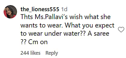 Another fan commented, “Thts Ms.Pallavi’s wish what she wants to wear. What you expect to wear under water?? A saree ?? Cm on (sic).”