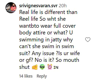One more fan wrote, “Real life is different than Reel life So wht she wantbto wear full cover body attire or what? U swimming in jatty why can’t she swim in swim suit? Any issue ?Is ur wife or gf? No is it? So mouth shut (sic).” Check out the comments below…