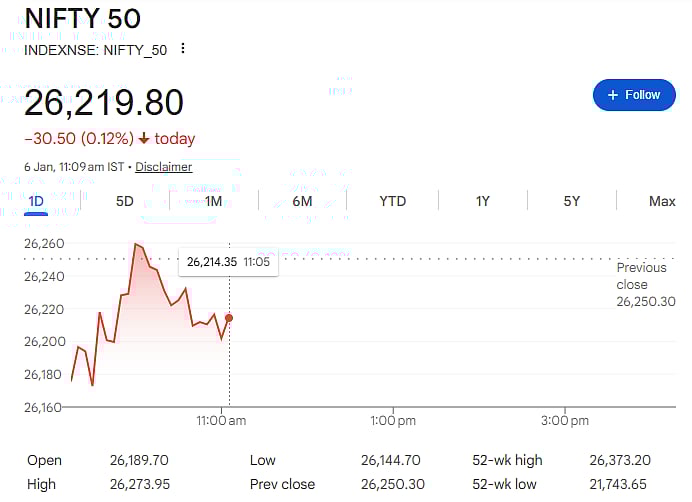 At around 11:06 am, the Sensex was down by 232 points (0.27 percent) at 85,206. The Nifty 50 slipped 30 points (0.17 percent) to 26,219.