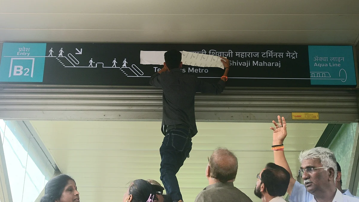Shiv Sena (UBT) Workers Call ‘Kotak’ Prefix on CSMT Metro Station an Insult, Cover Name with Sticker in Mumbai | GPlus/ Salman Ansari
