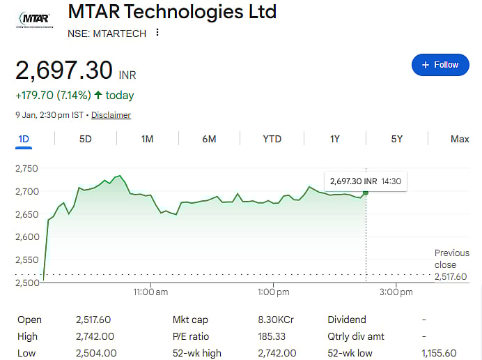 Over the past one week, MTAR Technologies shares have risen by more than 15 percent. In the last four months, the stock has delivered a strong return of around 94 percent, reflecting growing investor confidence.