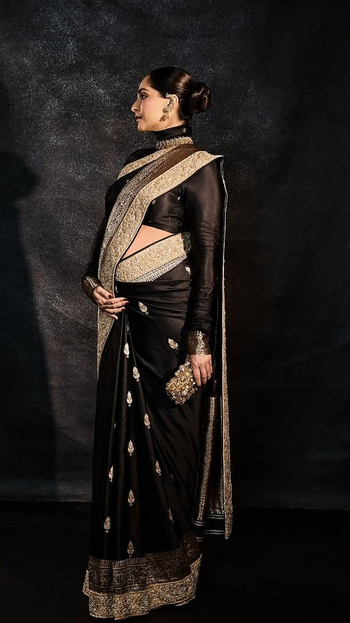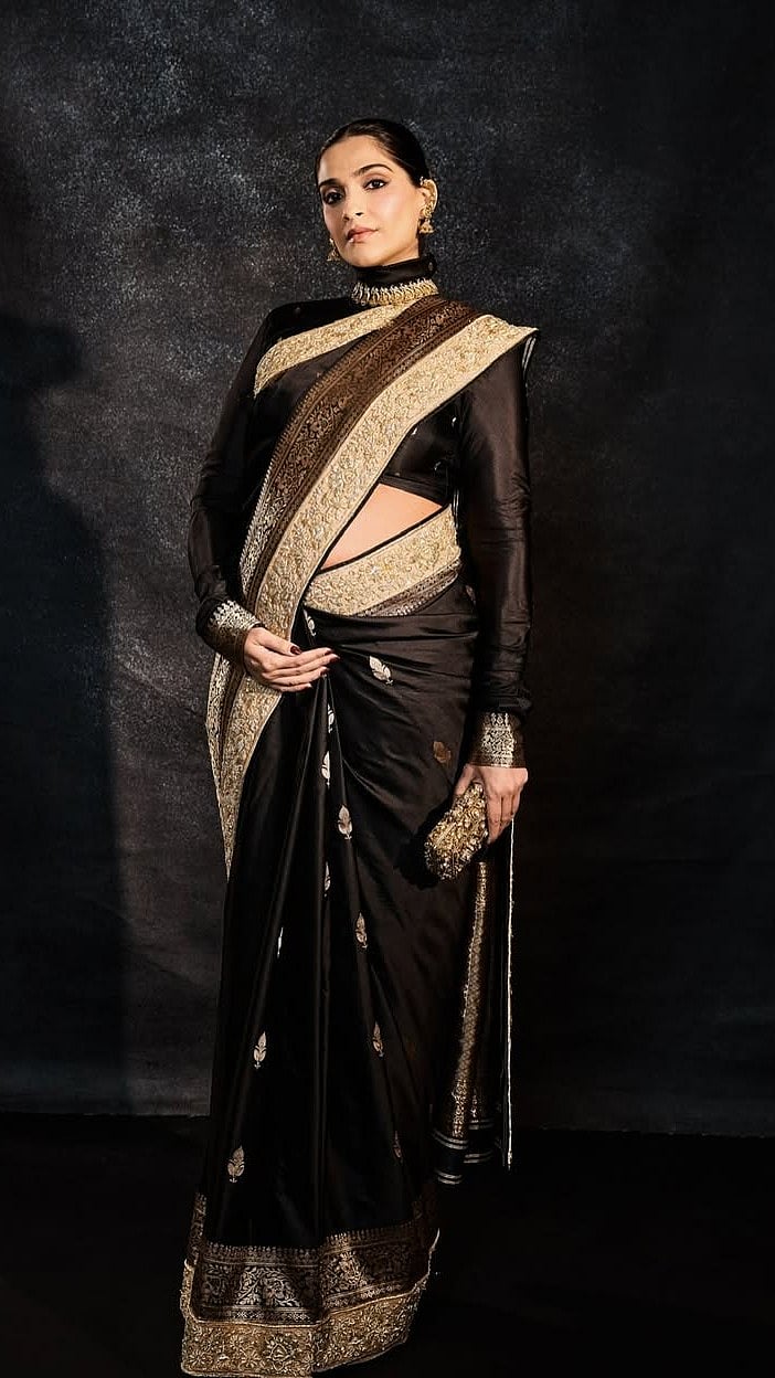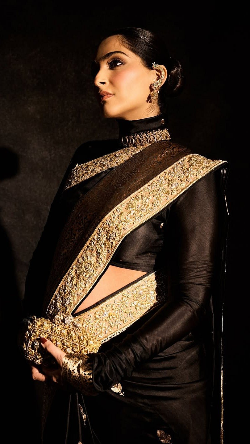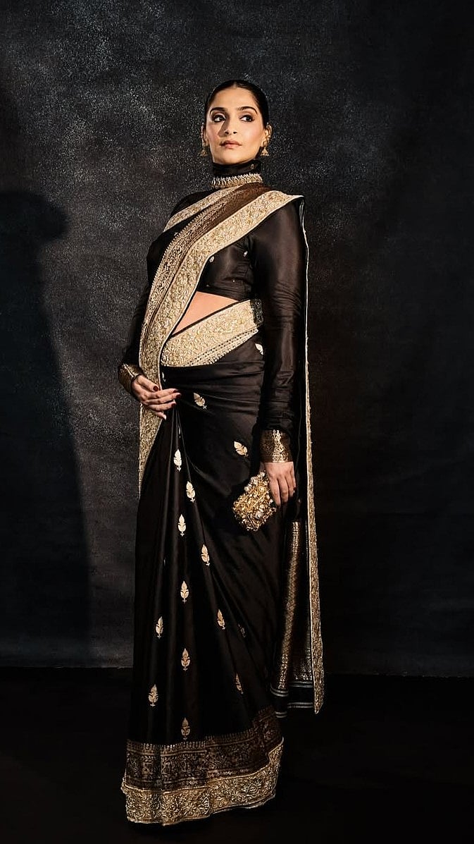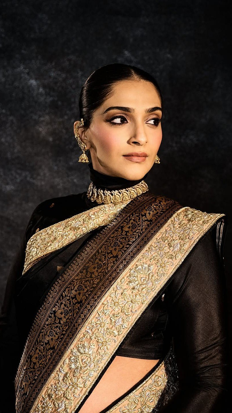 The saree featured the intricate Kadhwa weaving technique, highlighted with finely crafted zari borders The saree was paired with a high-neck black blouse, and styled in a classic back pallu style, reveal her bare baby bumpThe actress accessorised the timeless look with a statement gold choker, matching ear cuffs, and a sculpted gold clutchKeeping the focus on her outfit, Sonam wore minimal glam with soft-blushed cheeks, kohl-rimmed eyes, and nude lipsShe rounded off her glam with a sleek, centre-parted bun for a polished finish