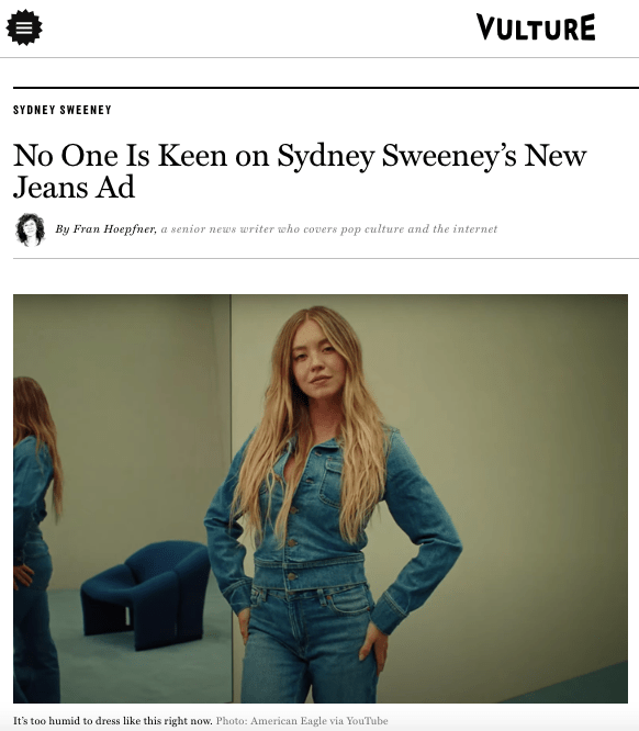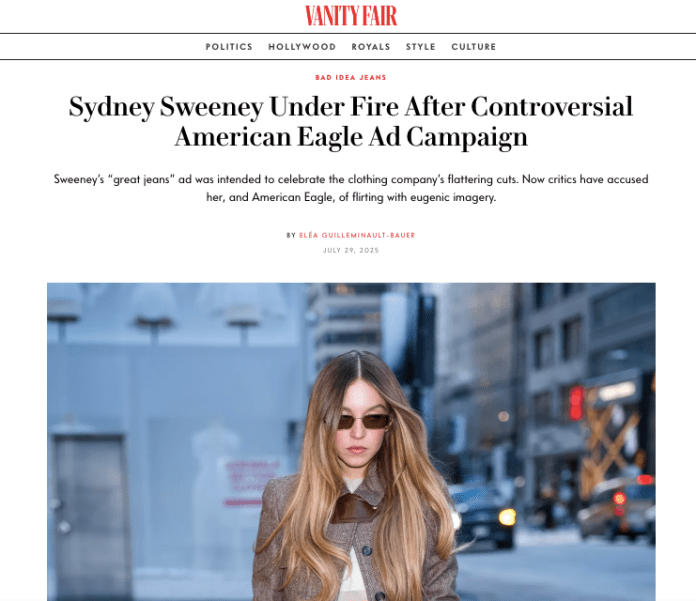 “Does Sydney Sweeney have ‘great jeans,’ or has the American Eagle brand simply had a very, very bad idea?” while noting that the campaign is “based around a play on words that may seem harmless − but has been criticized by onlookers who see a sinister message lurking beneath the pun,” the article reads.