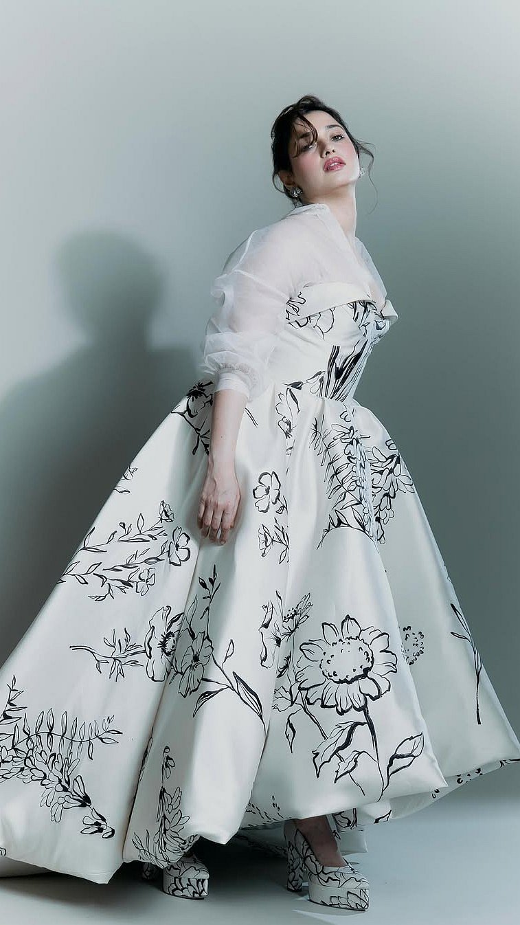 Tamannaah complemented her outfit with white heels that featured similar black floral detailing, completing the coordinated look