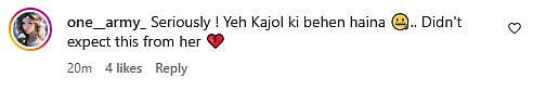A netizen commented, “Nanga Naach Ho Raha Hai Yeh Bollywood (sic).” Another Instagram user wrote, “Isko boldness nhi ashleelta kehte hai (sic).” One more netizen commented, “Seriously ! Yeh Kajol ki behen haina.. Didn’t expect this from her.”