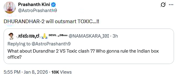 When another X user questioned him about Toxic and Dhurandhar 2 clash, Kini tweeted, “DHURANDHAR-2 will outsmart TOXIC…!! (sic)” He further wrote, “DHURANDHAR-2 fail to cross DHURANDHAR Box-office collections…!! TOXIC will fail to cross DHURANDHAR-2 Box-office collections….!! (sic).”