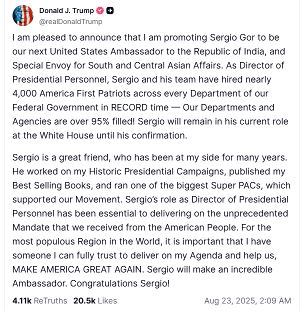 Announcing the decision on Truth Social, Trump said, “Sergio is a great friend, who has been at my side for many years.” On his appointment as ambassador to India, he said, “For the most populous Region in the World, it is important that I have someone I can fully trust to deliver on my Agenda and help us, MAKE AMERICA GREAT AGAIN. Sergio will make an incredible Ambassador. Congratulations Sergio!”