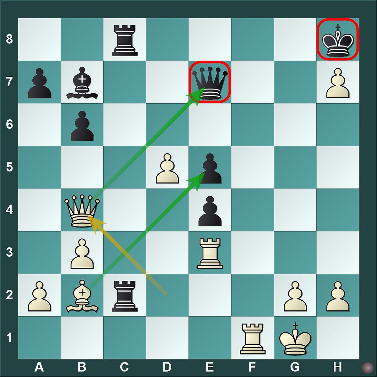 Taking the Black Queen loses, thanks to a beautiful sequence: 28… Qxb4 29. Be5 Check! Kh7 Did you notice how White managed to remove or deflect all of the Black King’s defenders ? 30. Rh3 Kg6 31. Rg3 Kh7 32. Rf7 Kh6 33. Bf4 all moves come with check Kh5 34. Rh7 finally delivering Checkmate.