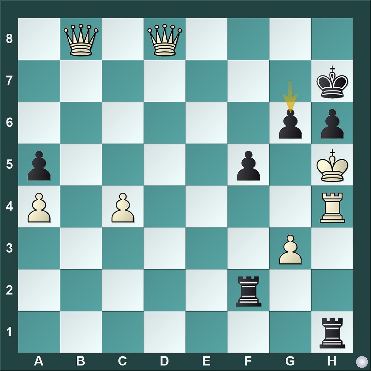 After move 27, Black’s rook has landed on the seventh rank, threatening both White’s queen and bishop. White’s pawn on h7 in fact blocks checks against the Black king on the ‘h’ file , thus playing the role of the Black King’s defender in some lines. White looks like he is in trouble.