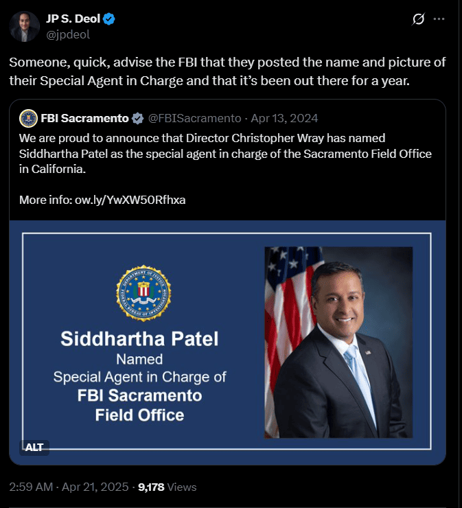 Deol later tried to rationalise his actions by claiming that FBI Sacramento itself has posted about its special agent.