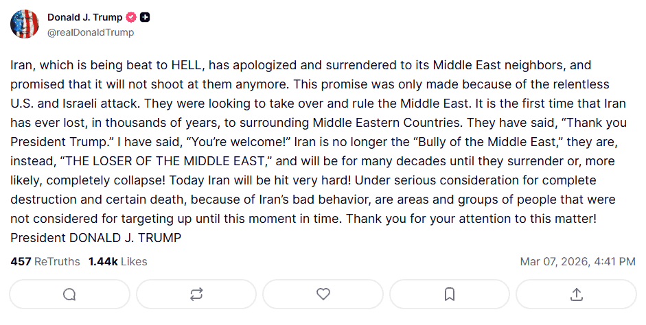 “Iran, which is being beat to HELL, has apologized and surrendered to its Middle East neighbors, and promised that it will not shoot at them anymore. This promise was only made because of the relentless US and Israeli attack,” Trump wrote.