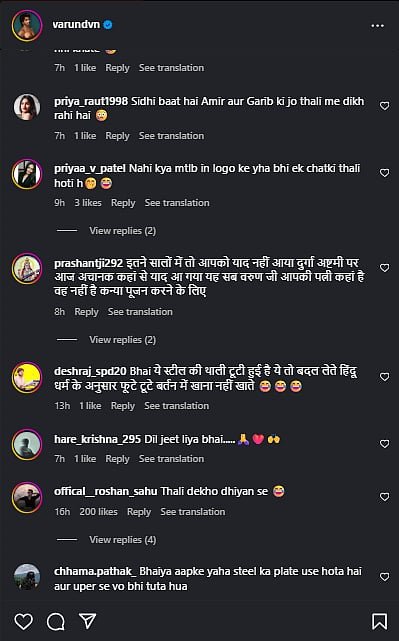 Reacting to the crack in Varun’s plate, a user commented, “Par Varun bhai kya aam logon ke gharo ki tarah apke gharo me bhi bartan chatke huye use hote hain.”