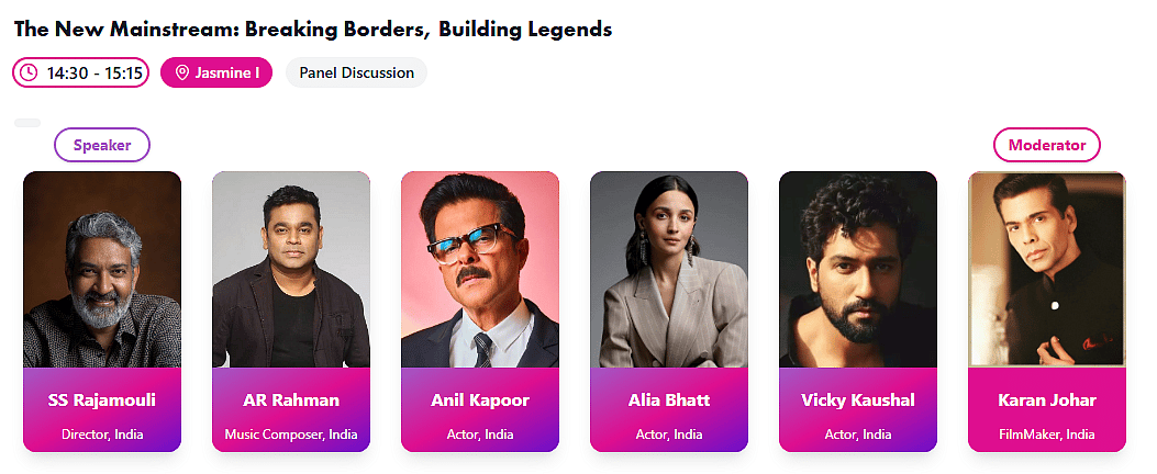 The panel will be moderated by Karan Johar, while the speakers enlisted are SS Rajamouli, AR Rahman, Anil Kapoor, Alia Bhatt and Vicky Kaushal.