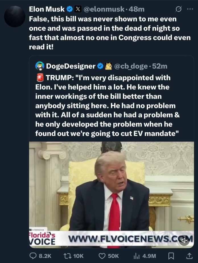 He claimed, “I’m very disappointed with Elon. I’ve helped him a lot. He knew the inner workings of the bill better than anybody sitting here. He had no problem with it. All of a sudden, he had a problem & he only developed the problem when he found out we’re going to cut the EV mandate.”